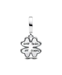 Wear an elegant symbol of luck with this spinnable four-leaf clover charm. Crafted from sterling silver and 14k gold plating, it features a sparkling 0.007 ct lab-grown diamond at its center. The front clover leaf spins, revealing the engraved message, “GOOD THINGS ARE COMING.” Transparent turquoise and blue enamel on the larger clover leaf add a vibrant touch. Style it with a delicate chain for everyday positivity or layer it with other meaningful pieces.
