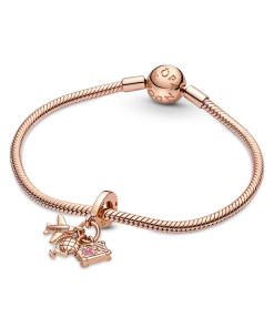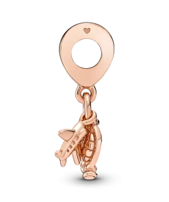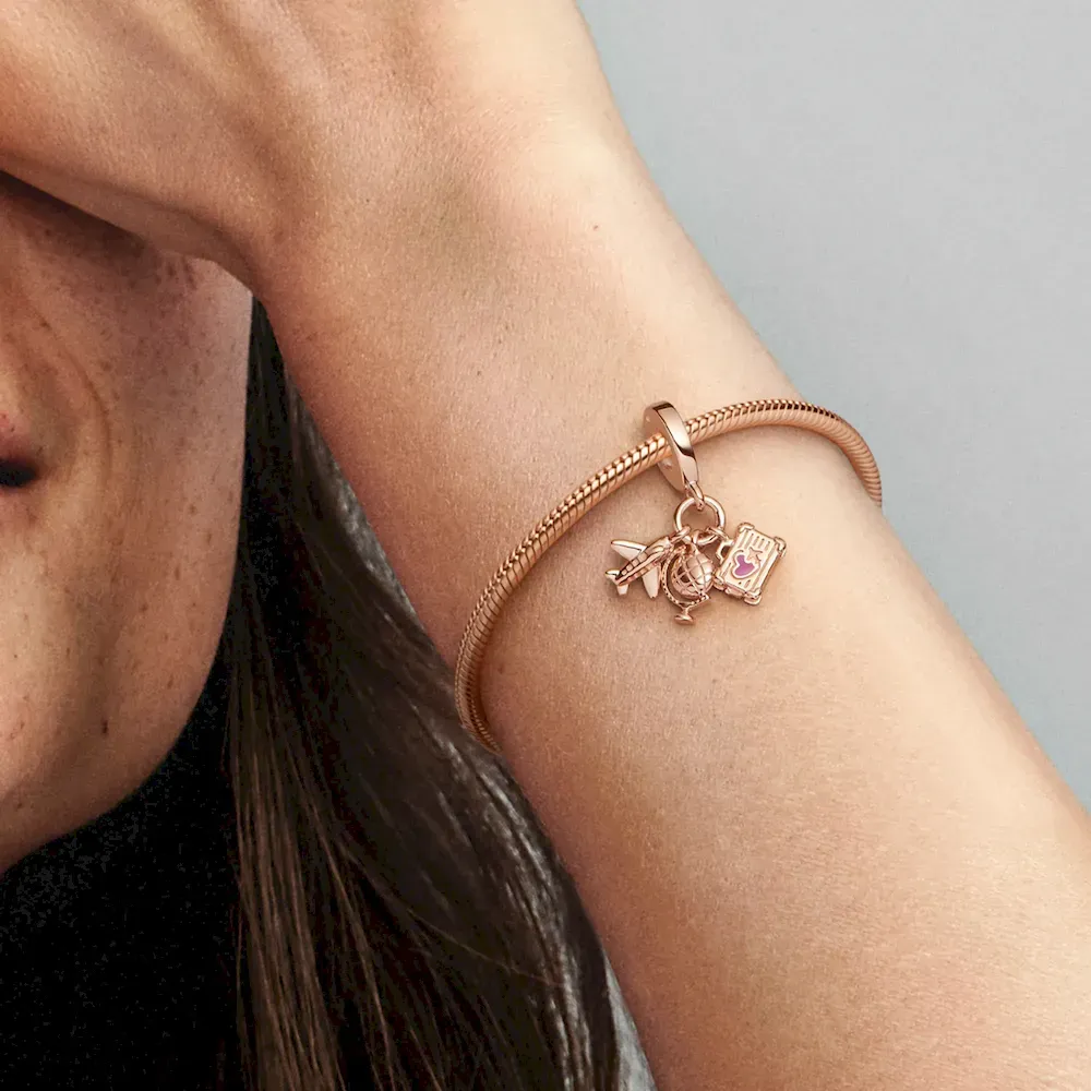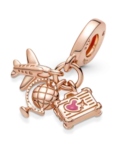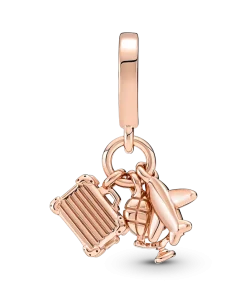 Fly away on a dream adventure with this 14k rose-gold plated travel charm. This triple dangle charm features three symbols of travel: an airplane, a globe and a suitcase with lifelike corner details and a tiny pink enamel heart. Style it on your Pandora Moments pieces to carry your travel memories with you and look forward to new adventures.