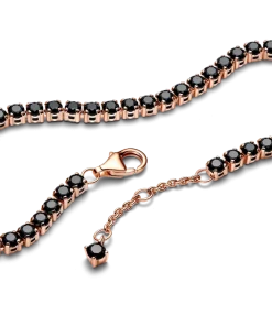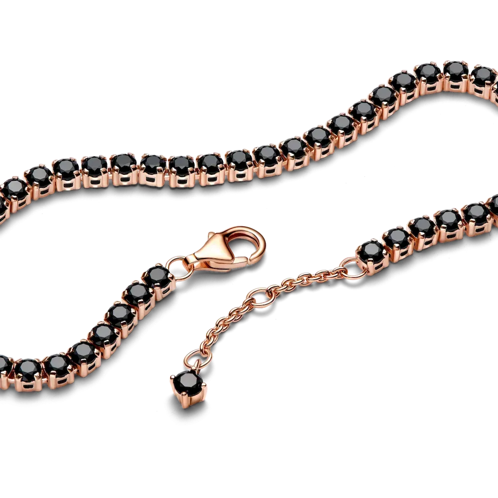 Add boldness to your look with the Black Sparkling Tennis Bracelet. Plated with 14k rose gold, it showcases 48 prong-set black man-made crystals in squared open baskets. The adjustable closure with a dangling stone offers a personalized fit. Ideal for stacking with various colors and metals, this bracelet introduces a bold black stone to Pandora’s Timeless collection. Experience the elegance of repetition and contrast, adding depth to your bracelet stack.