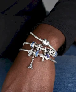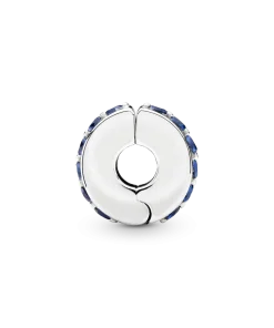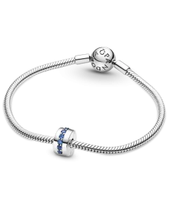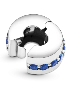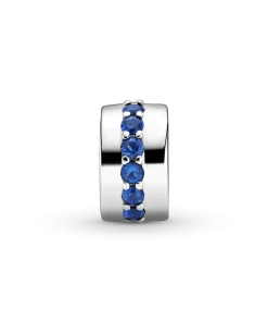 Always shine bright with the Blue Sparkle Clip Charm. Hand-finished in sterling silver, this classic round design features a centered row of shimmering blue stones. Style with other sterling silver pieces on your go-to Pandora Moments bracelet to separate out your charms and add a subtle hint of color. Alternatively, wear this piece with charms in Pandora Rose™ (14k rose gold-plated unique metal blend) for a mixed metal look that pops. This spacer charm features no silicone grip, so it will slide if not styled onto threads (two raised charm dividers).