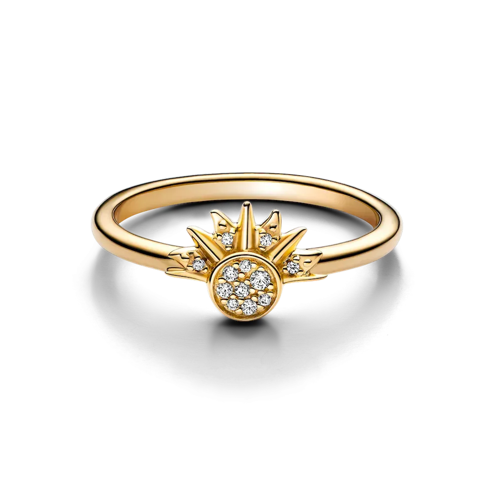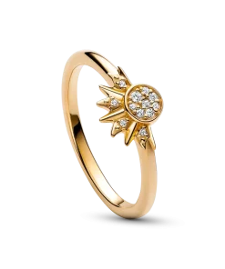 Radiate summer energy with the Celestial Sparkling Sun Ring. This hand-finished ring glows in 14k gold-plating, with a sun motif in the center formed by a circle of clear pavé with rays emanating from one side. Wear it by itself as a symbol of energy, positivity and life, or stack it with its counterpart, the Celestial Blue Sparkling Moon Ring. The two rings fit perfectly together, representing duality and harmony in nature and within ourselves.