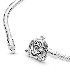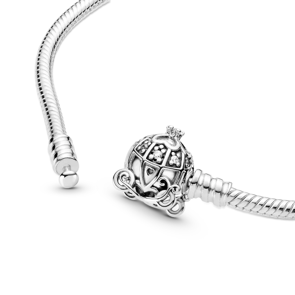 Make a wish with the Disney Cinderella Pumpkin Coach Clasp Pandora Moments Bracelet. Hand-finished in sterling silver, celebrate the 70th anniversary of Disney’s Cinderella with this bracelet. This piece features a pumpkin carriage with stone settings for windows, four hearts that form a clover and a 3D crown on the roof, a grooved heart for a door handle and pumpkin wheels. With the Pandora and Disney logos on the back, attach your favorite Disney x Pandora charms to this bracelet for a magical effect.