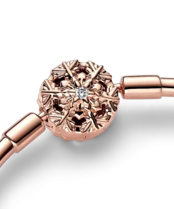 Catch a falling snowflake and wear it at the center of your story. This detailed 14k rose gold-plated bracelet features a special snowflake motif as its clasp, with intricate openwork details, creating a wintry effect. Small faceted and cut-out snowflake shapes reach out from the center of the snowflake, creating a magical winter look to bring a unique touch to your holiday styling.