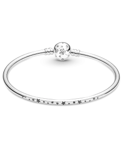 Inspired by the starry night sky, the Pandora Moments Stars & Galaxy Bangle will bring celestial sparkle to your look. Hand-finished in sterling silver, the bangle’s ball-shaped clasp features engraved stars and clear cubic zirconia stones, while the back side of the shank features engraved stars. This piece can be combined with up to 16-18 Pandora Moments charms and dangles. Wear this bangle with other celestial-inspired designs for a look that’s out of this world.