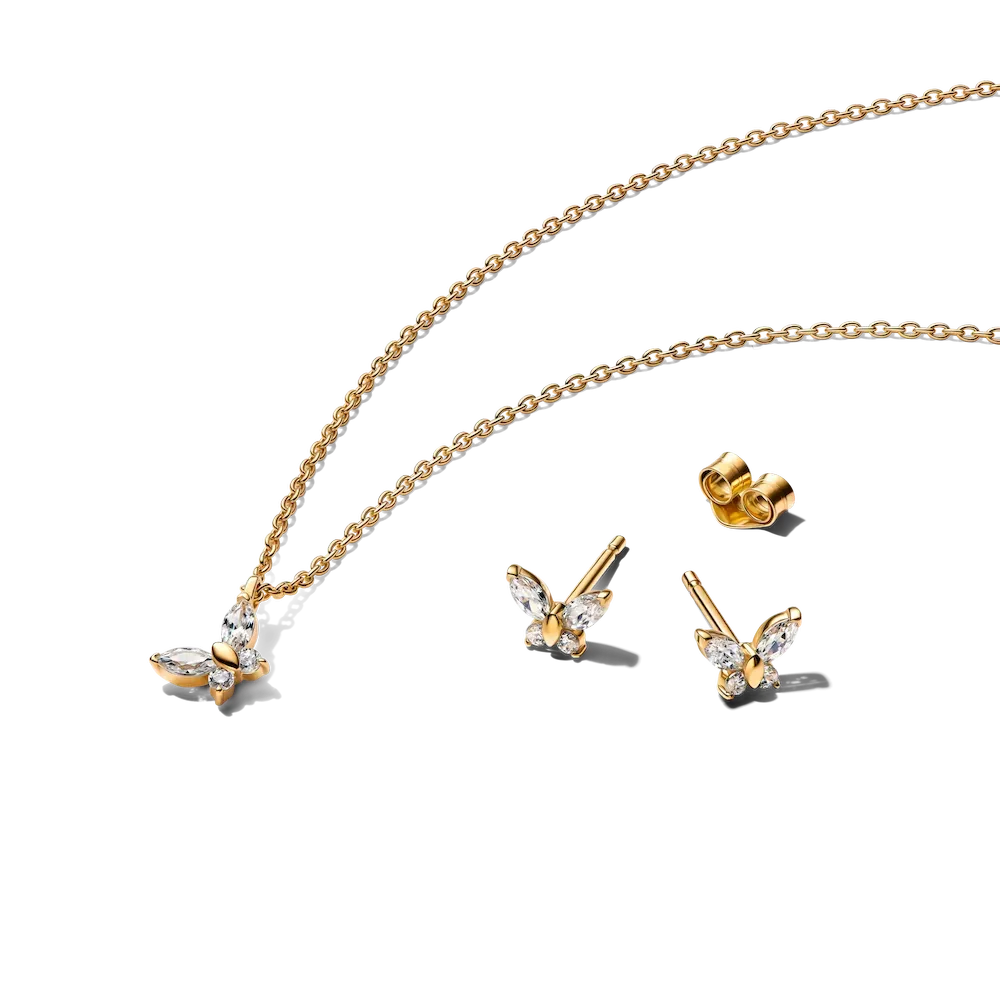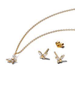 Give a gift that flutters and shines. Our 14k gold-plated butterfly themed set features a collier necklace and matching stud earrings – their sign to embrace change and set out on new adventures.