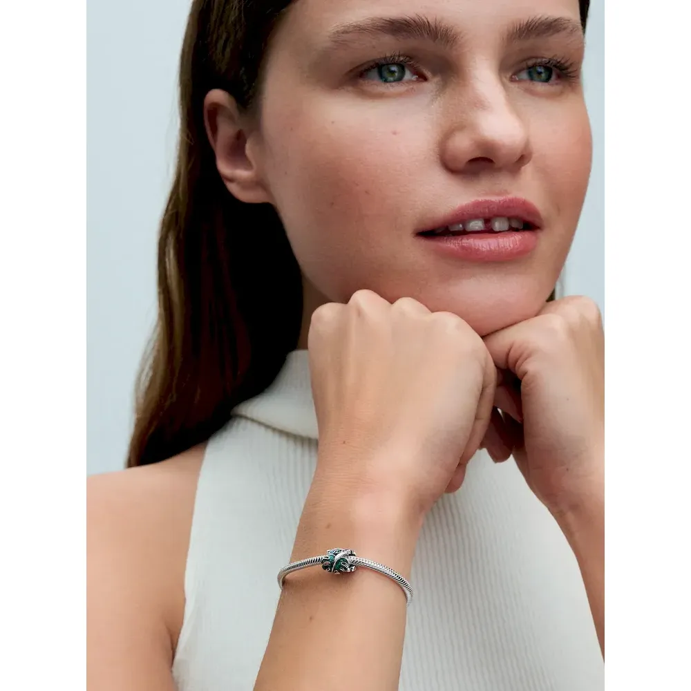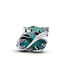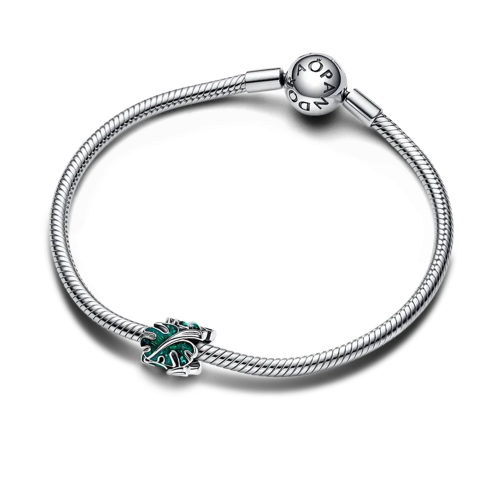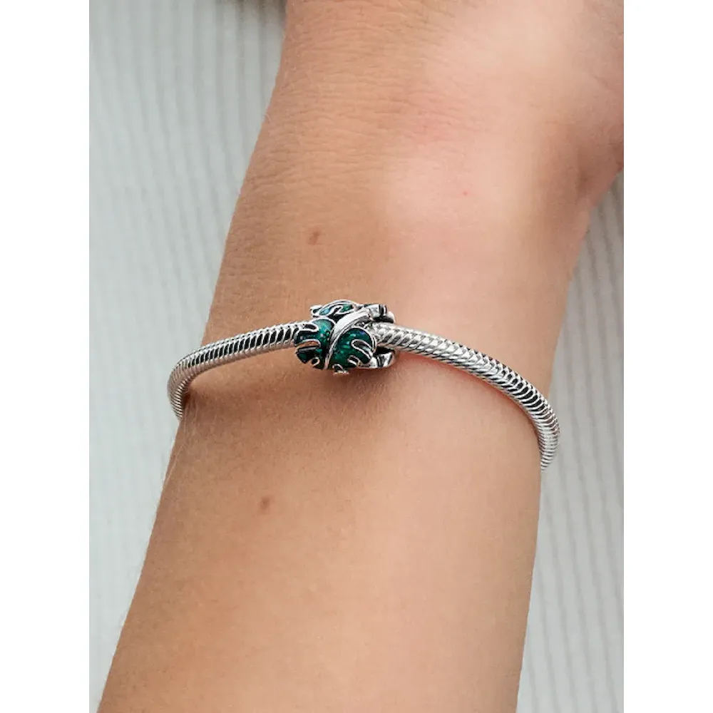 Wear an ode to nature with the Green Monstera Leaves Charm. This sterling silver leaf charm features three curled monstera leaves decorated with glittery green enamel. The leaves are spaced out and embellished with realistic slits and a raised stem, which ends in a heart-shaped profile. For plant lovers who feel most at home among vibrant plants, this colorful and intricate charm is a perfect gift or green-thumbed accessory.