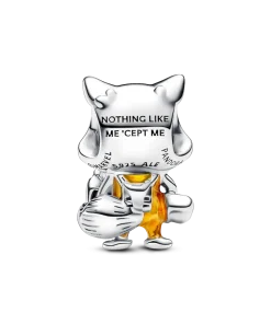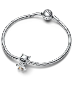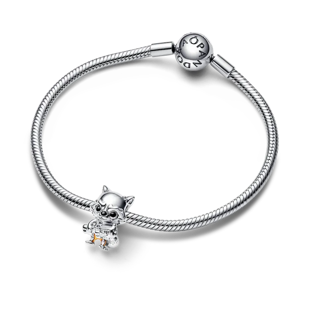 Our Marvel Guardians of the Galaxy Rocket Raccoon Charm. An expert pilot and marksman, Rocket poses with his Laser Cannon and Aero-Rigs jetpack. He is crafted in sterling silver with hand-applied enamel detailing to accentuate his jumpsuit and grumpy demeanor. His tail, lined with grooves to give it a fur-like look, curls around his body. Engraved with